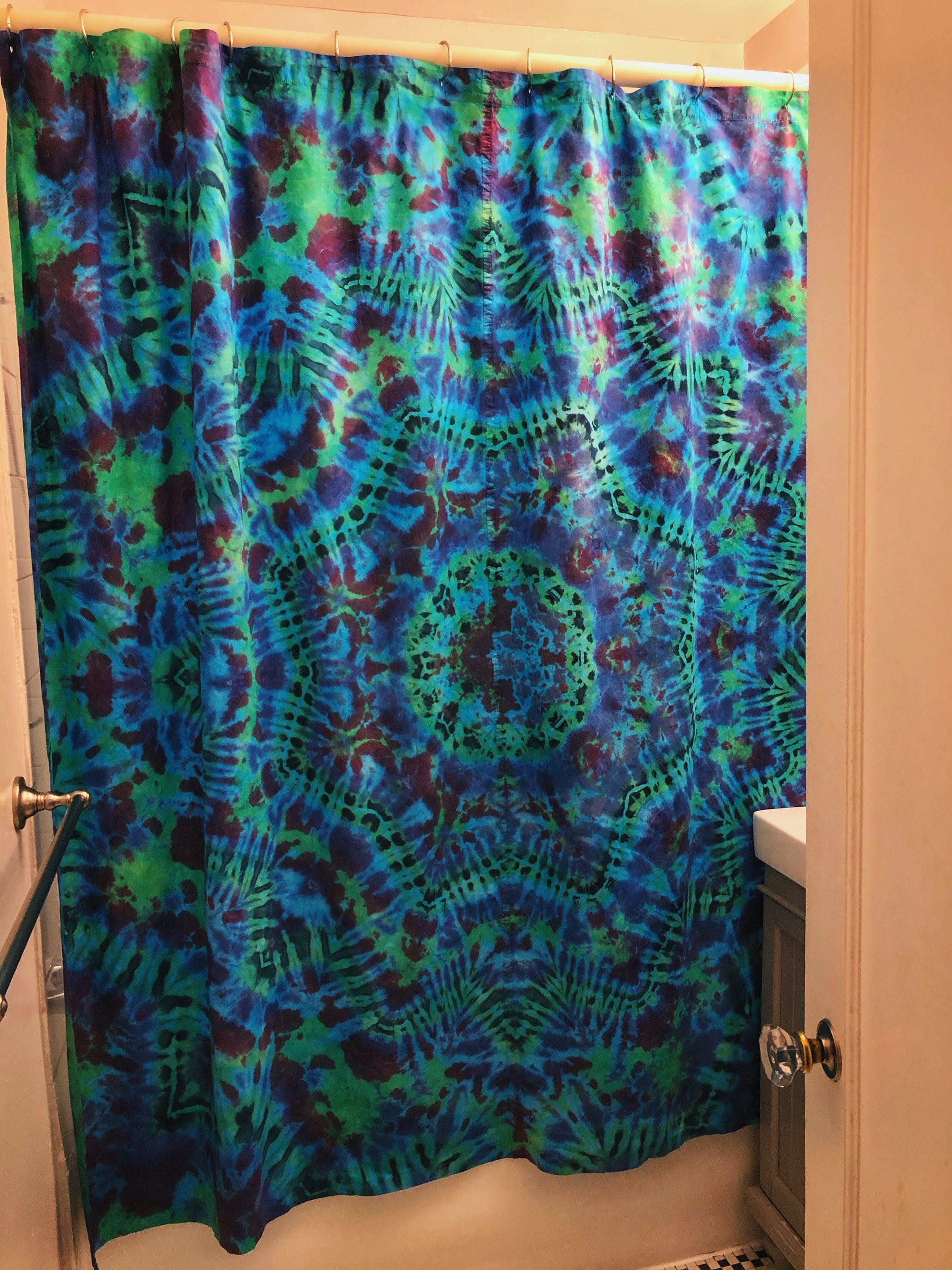 Tie Dye Shower Curtain Green Shower Curtain Yellow Accent Hippie Bathroom Tie Dye Bathroom Washable Fabric Bath Curtain. 4 out of 5 stars 6. The curtain top has a 2 top edge hem overlap with 12 stitched buttonholes to accommodate shower hooks not included.
